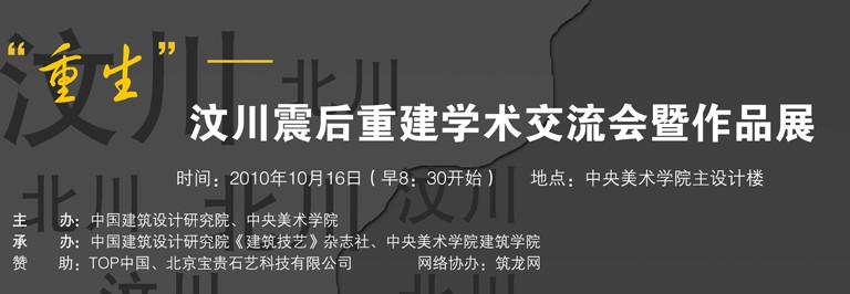 此次活動由中國建筑設計研究院和中央美術學院聯(lián)合主辦,《建筑技藝》雜志社承辦,于2010年10月15日、16日在北京中央美術學院舉行。崔愷和呂品晶為此次活動的策展人。 會議邀請到四川省住房和城鄉(xiāng)建設廳總規(guī)劃師邱建,中國城市規(guī)劃設計研究院副總規(guī)劃師朱子瑜,中國建筑設計研究院崔愷副院長、陳同濱歷史所所長、劉燕輝和李興鋼副總建筑師,家琨建筑設計事務所主持建筑師劉家琨,臺灣建筑師謝英俊,中央美術學院建筑學院院長呂品晶、設計學院副院長宋協(xié)偉,中國航空規(guī)劃建設發(fā)展有限公司總建筑師傅紹輝,北京市建筑設計研究院王小工等做大會報告,將就兩年多的重建工作進行總結、交流、探討,以期為建筑師、規(guī)劃師、重建項目的支持者以及建筑規(guī)劃專業(yè)的師生們對災后重建問題中的思考搭建一個學術交流平臺,為此后長期的、更多層面的、不可預知的災后重建工作提供有益借鑒。