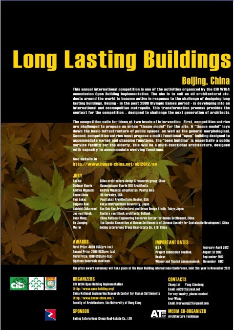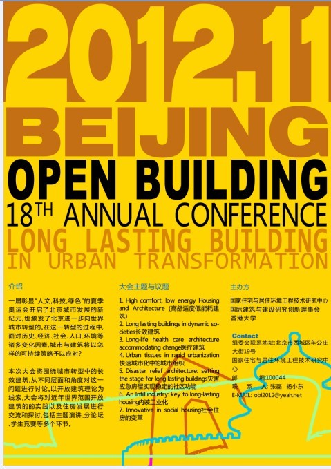 開放建筑年會(huì)是國際建筑與建設(shè)研究創(chuàng)新理事會(huì)(CIB)每年就全世界范圍內(nèi)交流開放建筑研究成果的重要活動(dòng),第18屆國際開放建筑大會(huì)將于2012年11月在北京召開,這也是中國第一次主辦該項(xiàng)國際會(huì)議。本次國際會(huì)議將由國際建筑與建設(shè)研究創(chuàng)新理事會(huì)、國家住宅與居住環(huán)境工程技術(shù)研究中心、香港大學(xué)聯(lián)合主辦,論壇將包括主題演講、論文發(fā)言、國際設(shè)計(jì)競(jìng)賽等多個(gè)環(huán)節(jié)。