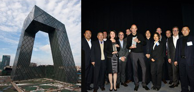 世界高層建筑學(xué)會(huì)(CTBUH)"2013年度高層建筑獎(jiǎng)"評(píng)選11月7日晚在美國(guó)芝加哥揭曉,中央電視臺(tái)新址大樓成為最大贏家,獲得唯一的最高獎(jiǎng)“全球最佳高層建筑獎(jiǎng)”。主創(chuàng)建筑師庫(kù)哈斯(中間手捧獎(jiǎng)杯者)、中方合作設(shè)計(jì)單位代表華東建筑設(shè)計(jì)研究院顧問(wèn)總工程師汪大綏(左二)及承建方中建總公司等代表共同領(lǐng)獎(jiǎng)。