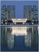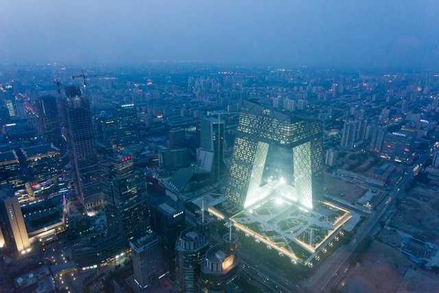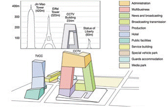 央視大樓位于北京的CBD區(qū)域,建筑面積470000m2。OMA的設(shè)計(jì)成功地把所有功能安置在一座建筑內(nèi)——一個(gè)“把各項(xiàng)活動(dòng)互相連接在一起的循環(huán)”。234m高的大樓外形像是一個(gè)三維連續(xù)彎折的循環(huán),內(nèi)部包含整個(gè)電視制作過(guò)程所需的新聞、廣播、演播室、行政辦公區(qū)及公共區(qū)域。大樓的兩棟塔樓以10?傾斜、13層樓高的懸臂在162m的高空處連接,底部則是10層樓的裙房與3層地下室。公共設(shè)施包含一個(gè)劇院、酒店及電視文化中心(TVCC),整個(gè)建筑群通過(guò)一個(gè)專(zhuān)門(mén)的服務(wù)樓提供全部樓宇設(shè)備服務(wù)。整個(gè)項(xiàng)目在包含外部功能媒體園的187000m2場(chǎng)地上進(jìn)行開(kāi)發(fā),總建筑面積599000m2。