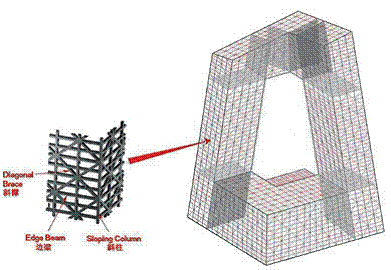筒體的初始設(shè)計(jì)是以柱、周邊圈梁和斜撐有規(guī)律地組成兩層樓高的典型模塊化組件。之所以選擇這種方案,是為了適應(yīng)塔樓內(nèi)若干處于二層高的演播室。然而初步分析結(jié)果顯示,大樓斜撐的受力在結(jié)構(gòu)的不同位置變化相當(dāng)大,特別是集中于懸臂的根部以及與基座連接的部分。因此在優(yōu)化過(guò)程中,根據(jù)設(shè)計(jì)所需的強(qiáng)度和剛度,以地震分析為準(zhǔn),通過(guò)增加或減少斜撐而變化(如翻倍或減半布置斜撐)。該過(guò)程中始終與建筑師保持著緊密的合作,因?yàn)樾睋蔚牟贾脹Q定著外立面是否美觀。優(yōu)化工作亦在一定程度上使斜撐構(gòu)件截面尺寸標(biāo)準(zhǔn)化。
