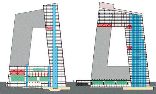 施工期間,斜撐筒體結(jié)構(gòu)為傾斜的塔樓提供足夠的剛度,使兩塔樓在連接并相互支撐前都能在嚴(yán)格的允許誤差范圍內(nèi)安全地施工。此結(jié)構(gòu)亦適合懸臂部分的建造,容許兩個(gè)半截的懸臂部分在連接前分別臨時(shí)懸挑于兩塔樓之上。除了外部部分柱由于荷載較大的原因而使用了型鋼混凝土柱外,大樓內(nèi)所有的結(jié)構(gòu)支撐構(gòu)件都為鋼結(jié)構(gòu)構(gòu)件。