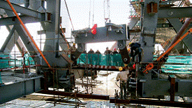 在兩座塔樓頂部的鋼結(jié)構(gòu)完成后,懸臂部分的施工于2007年8月正式開(kāi)始,在接下來(lái)的5個(gè)月內(nèi),結(jié)構(gòu)構(gòu)件從兩座塔樓上逐件向外懸挑出來(lái)。承包商在最初的連接階段選擇在懸臂內(nèi)角安裝7個(gè)連接構(gòu)件。在2007年12月8日上午9時(shí)左右,7個(gè)構(gòu)件被吊至適當(dāng)位置后(在10mm的允許誤差內(nèi))用軸承臨時(shí)固定后,塔樓慢慢地互相移近。