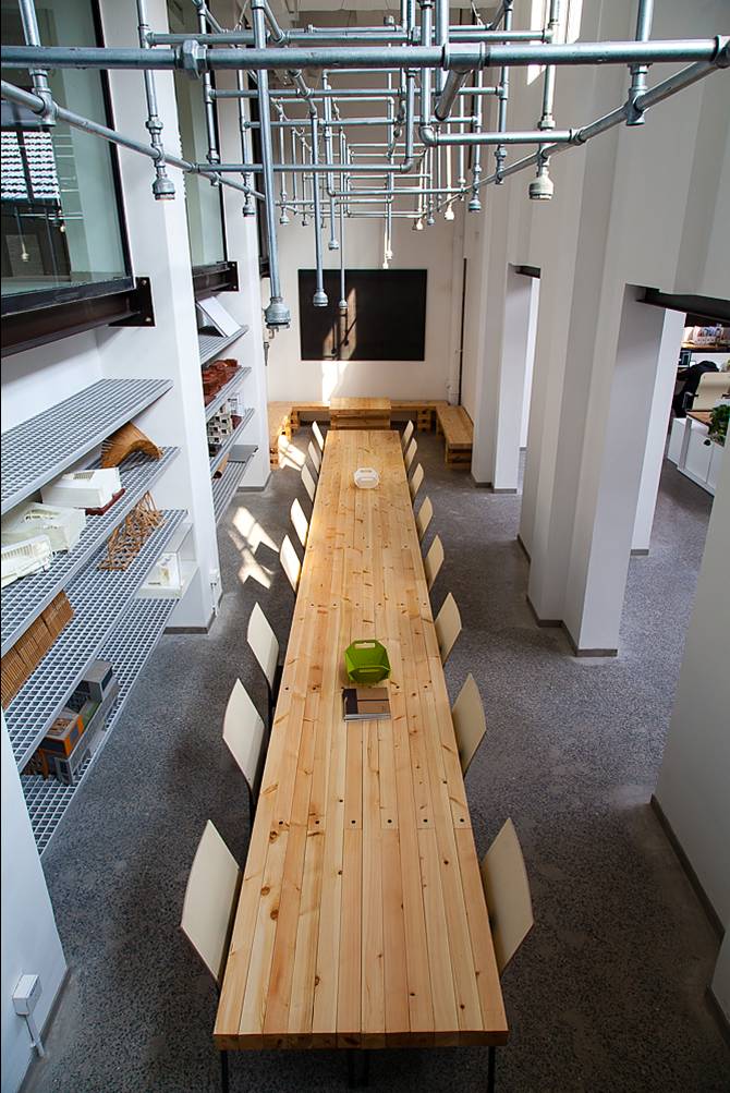 章明:以新近完成并搬遷的原作設計工作室為例,講述了一個連做倉庫都被嫌棄的上海鞋釘廠老廠房,經(jīng)設計師的妙手化腐朽為神奇。利用混凝土密封固化劑整理地坪,保留青磚墻面和木屋架,白水泥材料輔以陰刻字被應用于桌面,木材以燕尾榫拼接設計的會議桌,自行設計并安裝的鍍鋅水管燈,植物、水面組成的庭院向工作空間開放……原有的老廠房依稀可見,但已完全換做新的功能。