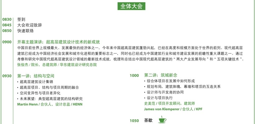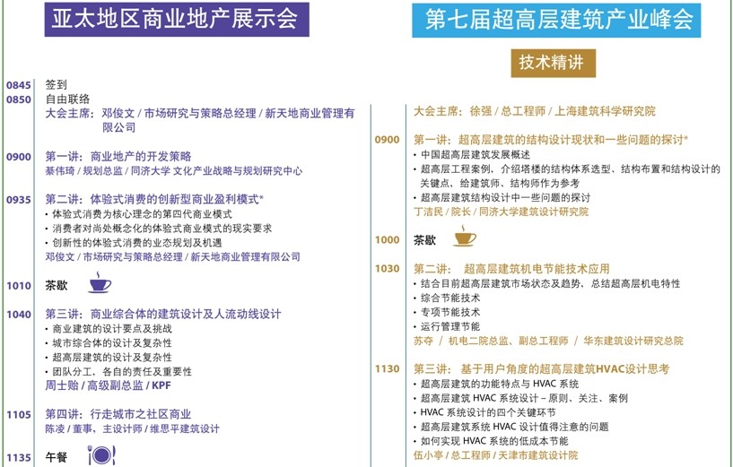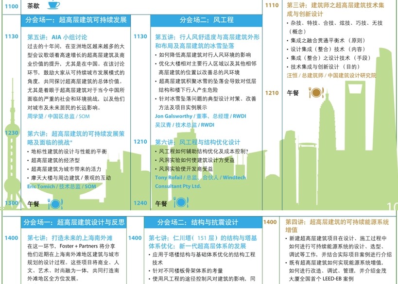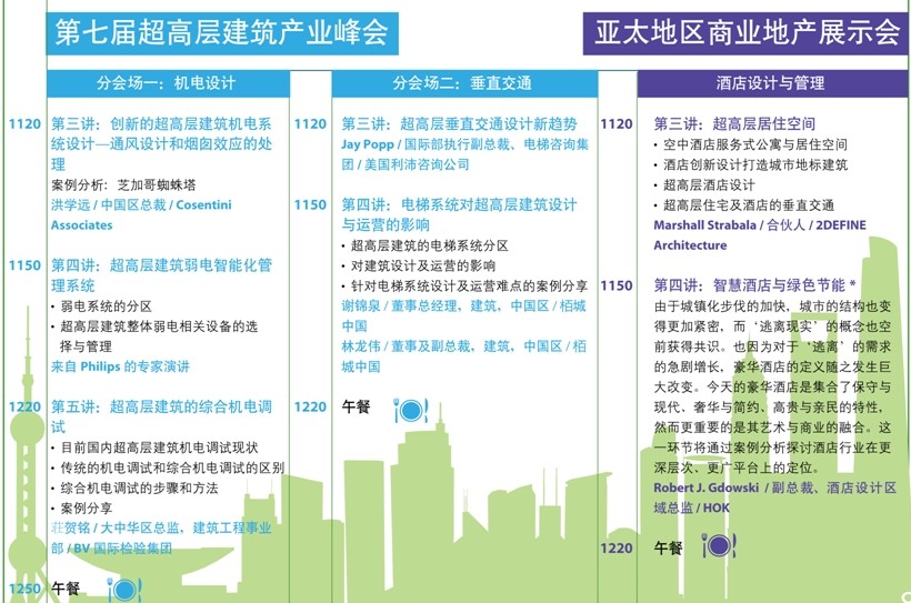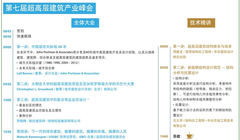 2014年第七屆超高層建筑產(chǎn)業(yè)峰會(huì)分為“開發(fā)商專場(chǎng)”與“學(xué)術(shù)專場(chǎng)”兩大主體。“開發(fā)商專場(chǎng)”將針對(duì)性地覆蓋開發(fā)商在建筑及結(jié)構(gòu)設(shè)計(jì)、機(jī)電、消防、風(fēng)工程及項(xiàng)目管理等方面的重點(diǎn)關(guān)注與難點(diǎn)。“學(xué)術(shù)專場(chǎng)”則為來自建筑設(shè)計(jì)研究院的建筑師、結(jié)構(gòu)工程師和機(jī)電工程師們提供為期兩天的專業(yè)技術(shù)研討論壇。