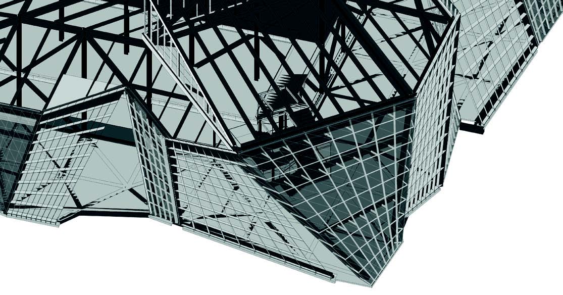 復雜形體的實現(xiàn)首先是設(shè)計信息的全面準確表達。利用BIM設(shè)計平臺的圖紙表現(xiàn)與信息綜合能力,可以準確高效地進行施工圖階段建筑、結(jié)構(gòu)、幕墻各工種的配合以及項目實施過程中出現(xiàn)的設(shè)計問題反饋。同時我們也發(fā)現(xiàn),BIM模型可以進行高效的信息輸出與整合,背后的控制思想與參數(shù)化方法有類似之處。如果信息輸入的接口更為開放,將形體生成過程中的設(shè)定參數(shù)與BIM模型的控制參數(shù)對接,實現(xiàn)建模軟件平臺與BIM平臺的整合,參數(shù)化設(shè)計的能力將更為強大。