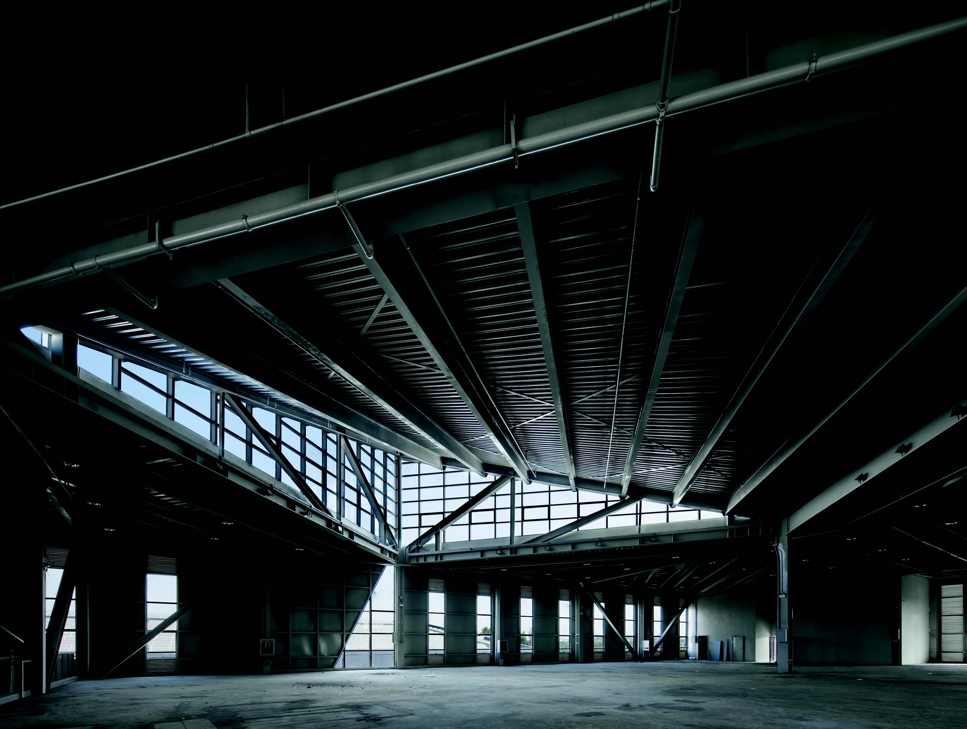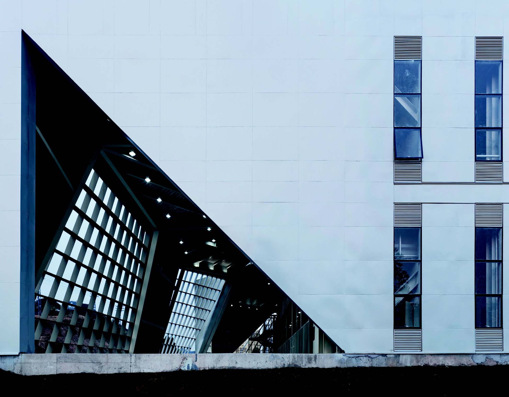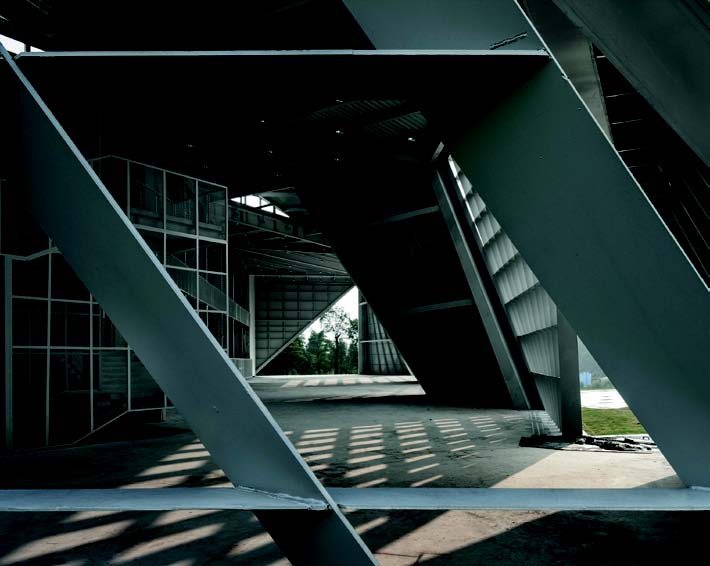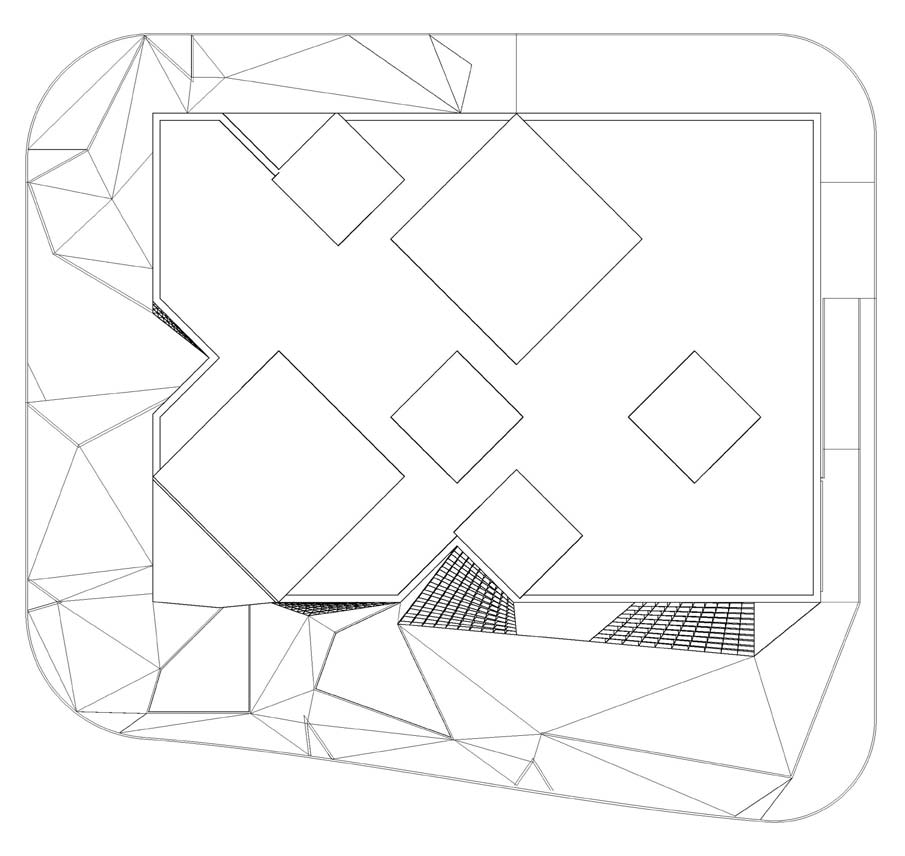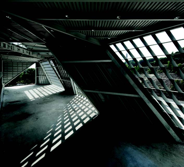 幕墻全尺寸試樣焊接完畢后,焊縫的處理成為一個難題。預(yù)想的處理方法是焊接完成后逐一打磨,由于焊縫的數(shù)量大,打磨費工費時。通過試樣發(fā)現(xiàn),打磨用的砂輪會在焊縫周邊留下明顯的痕跡,表面噴涂后痕跡會更加明顯。如果保留焊縫,整體效果將十分粗糙。是否打磨焊縫成為一個兩難的選擇。正當設(shè)計陷入困境時,走訪加工單位發(fā)現(xiàn),用于加工鋼板的折彎機可以精確地按照預(yù)定角度將鋼板折彎。因此,我們提出將三角形幕墻單元兩兩組合為四邊形單元,對角線用折彎機加工,這樣僅焊接四邊即可。這一方法大大減少了焊接量。折彎的壓痕形成精細的轉(zhuǎn)折線條,與周邊粗獷的焊縫形成對比。幕墻整體形成了對角線與四邊形兩個方向網(wǎng)格交織的特殊肌理,在不同光線下將產(chǎn)生微妙的光影變化。