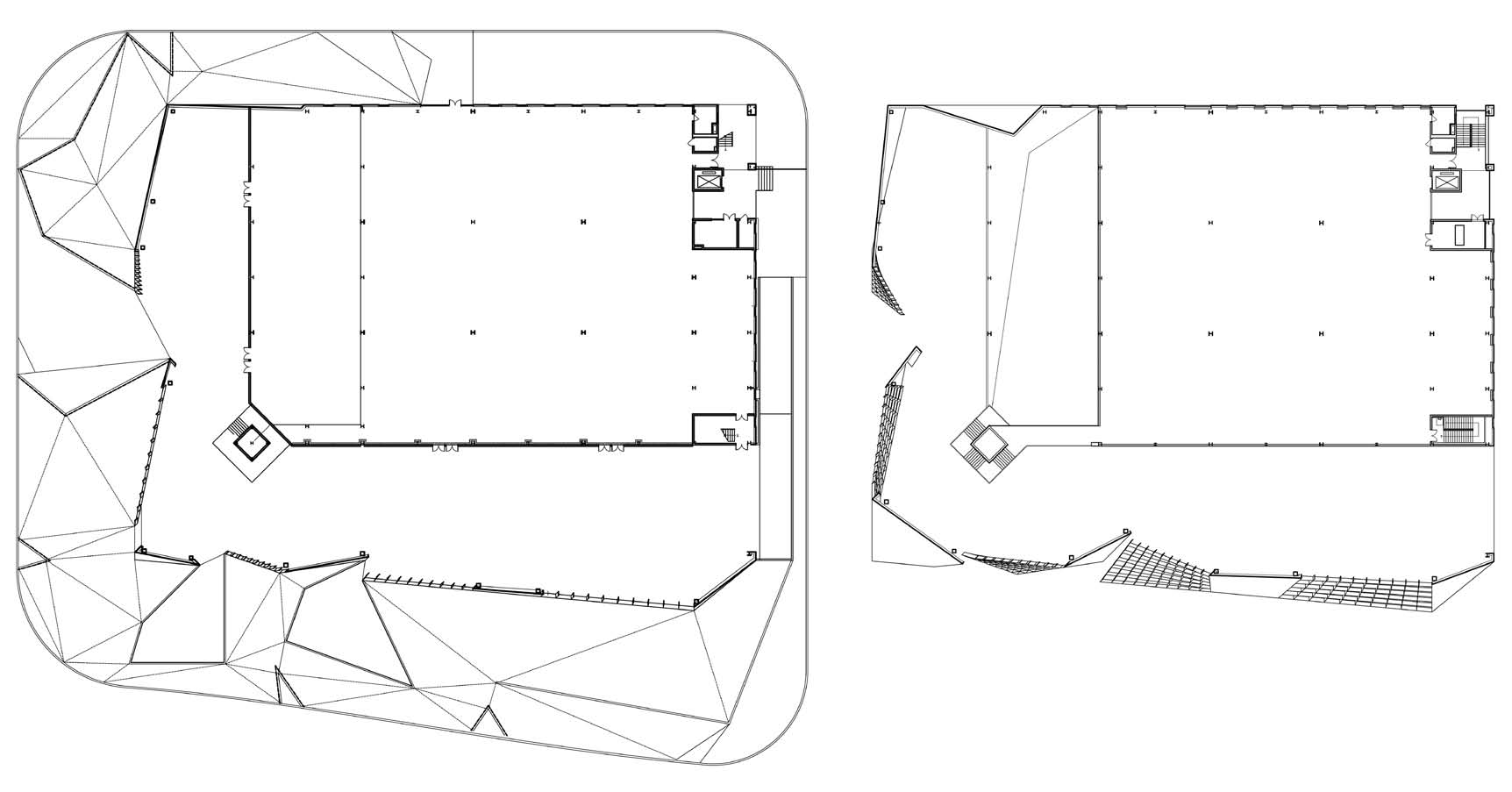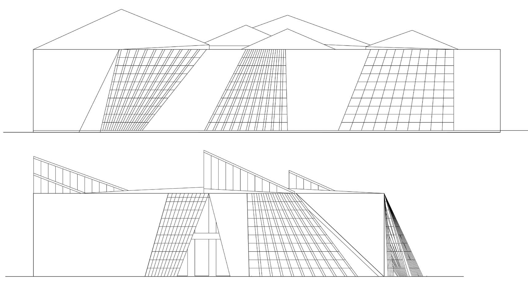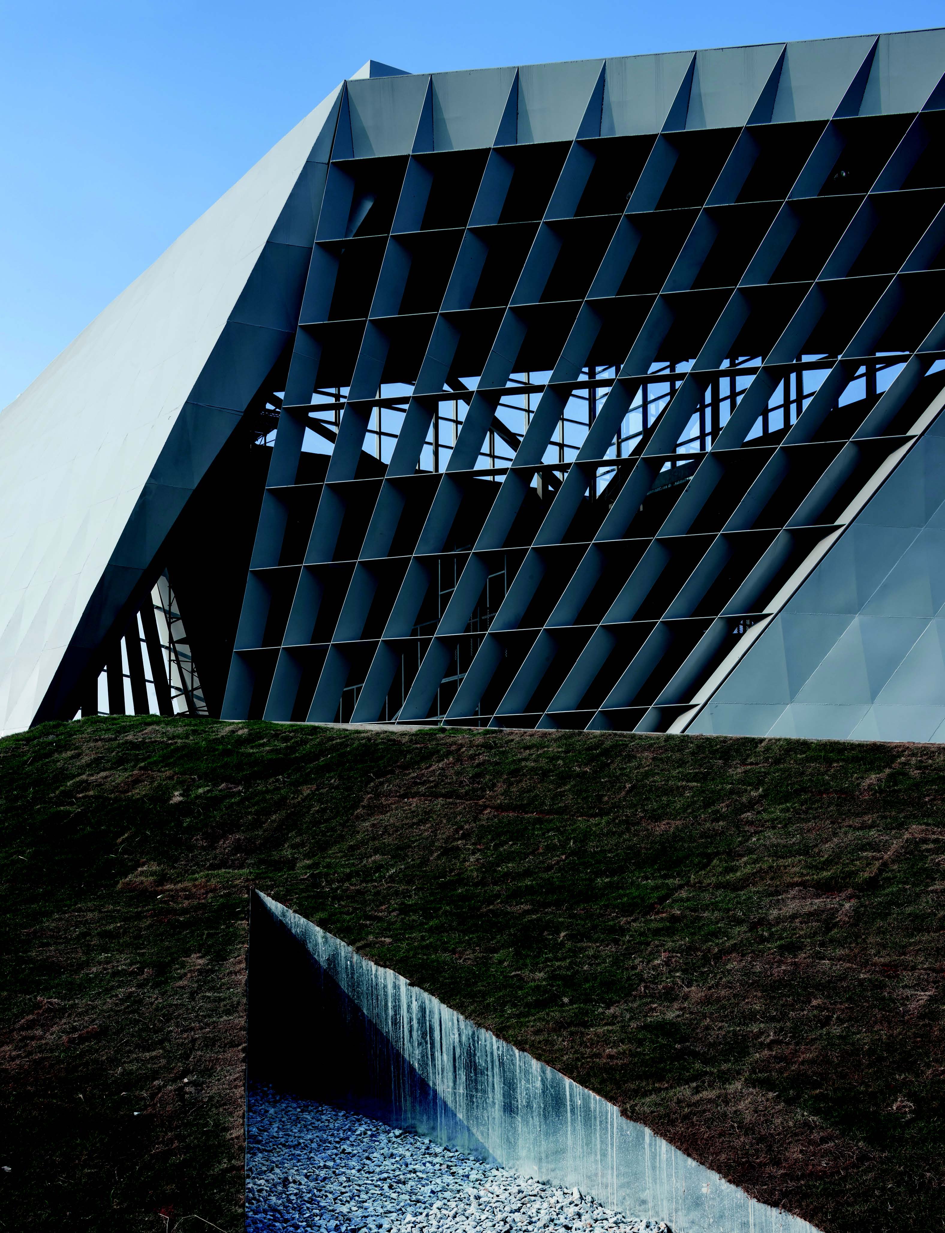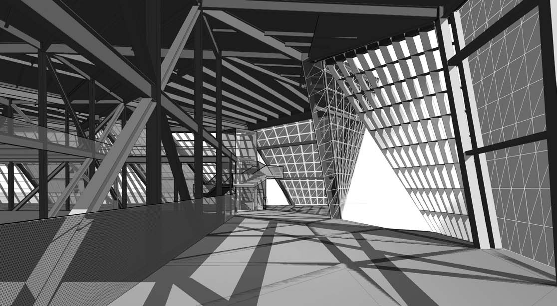 萬科創(chuàng)展中心位于東莞松山湖萬科集團住宅產(chǎn)業(yè)化研究基地內(nèi),是萬科集團住宅建筑設(shè)計、住宅精裝修研發(fā)與展示的基地。內(nèi)部要求14m柱跨的通用空間。用地北部為已建成的研究廠房,南側(cè)為基地邊界的自然土坡。結(jié)合內(nèi)部空間要求和外部環(huán)境,創(chuàng)展中心由14m柱跨的方盒子開始,將屋頂及東側(cè)、南側(cè)的墻體撕裂、扭轉(zhuǎn),形成光線和空氣進入建筑的通道。扭轉(zhuǎn)的墻體虛實相間,分別轉(zhuǎn)化為封閉的曲面鋼幕墻和扭曲的鋼格柵。支撐斜柱隱藏在曲面幕墻內(nèi),鋼格柵在增強通風效果的同時,也作為遮陽構(gòu)件起到遮陽作用。兩者虛實相間形成的豐富形體與南側(cè)自然地形相呼應(yīng)。為了實現(xiàn)這一設(shè)計構(gòu)思,從幾何形態(tài)、參數(shù)化設(shè)計技術(shù)、構(gòu)造節(jié)點等方面提出了相應(yīng)的措施。