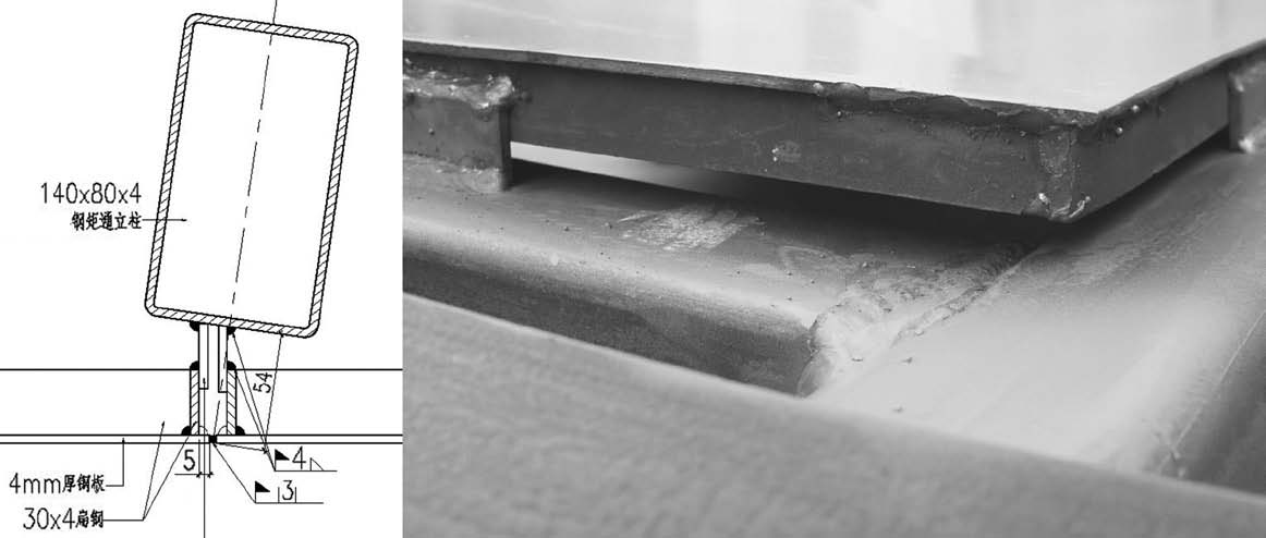 曲面鋼板幕墻是由多個小的平面單元拼接而成的,初期方案擔心安裝精度難以保證,將幕墻單元拼接設(shè)計為明縫。這一設(shè)計需要在鋼板背面增加防水層,構(gòu)造復雜,造價難以承受。因此將幕墻拼縫改為焊接密封,焊縫允許的最大寬度有限,且幕墻單元數(shù)量較多,精度要求較高。幕墻節(jié)點設(shè)計進行了不同方案的試樣對比研究,最終采取在每一幕墻單元設(shè)可調(diào)節(jié)的定位鋼片進行初步定位,待整片幕墻對縫確認完畢后再進行焊接固定的方法。實際應(yīng)用的效果簡便易行,安裝快速。