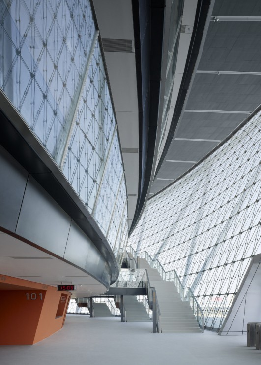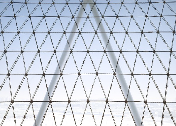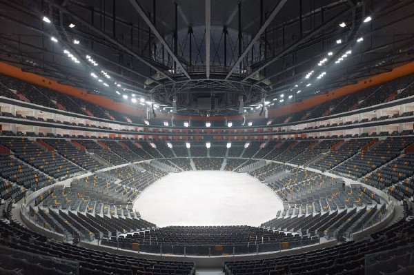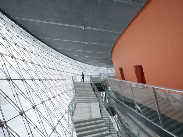體育館豐富多樣的設(shè)計(jì)手法再現(xiàn)了籃球運(yùn)動(dòng)的幾個(gè)元素:建筑主體位于一座抬高的基座上,屋面環(huán)狀流線令人聯(lián)想到籃筐的邊緣,網(wǎng)狀的立面系于其下。賽場(chǎng)主體外墻顏色采用籃球所有的典型橙色,在網(wǎng)狀幕墻結(jié)構(gòu)之后格外鮮明,另外賽場(chǎng)內(nèi)部也使用了橙色進(jìn)行裝點(diǎn)。放射狀的屋面直徑157米,為一個(gè)外置呈波浪狀的壓力環(huán)。其上懸掛了28根鋼柱,對(duì)屋面的桁架結(jié)構(gòu)起到穩(wěn)定加固的作用。屋面坐落于之字型鋼柱之上。體育館外立面為世界范圍內(nèi)首次使用的三向網(wǎng)格曲面索網(wǎng)幕墻體系,并以中空安全玻璃封閉。