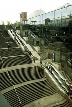 其獨(dú)特之處在于設(shè)計(jì)師結(jié)合辦公樓的娛樂休息空間,創(chuàng)造了一個(gè)有活力的浮游領(lǐng)域,超高層大樓頂部是一個(gè)巨大的圓孔,以減小壓力,光線由此進(jìn)入,人們可以通過它遙望太空,空中露臺(tái)、空中花園、空中自動(dòng)扶梯等把兩個(gè)超高層建筑結(jié)合在一起,形成令人振奮的空間構(gòu)成。同樣令人振奮的還有京都火車站這個(gè)項(xiàng)目,我相信原廣司再設(shè)計(jì)之初也苦惱于太多的限制條件,其中一條就是車站的總占地被限制在總面積的二十分之一中,而設(shè)計(jì)師的創(chuàng)造靈感就是來自于這一矛盾的解決中,他設(shè)想了一個(gè)地區(qū)性的社居場所,于是這個(gè)建筑帶有一個(gè)巨大的鋼結(jié)構(gòu)玻璃頂棚,下面是尺度巨大的漫無止境的大臺(tái)階,我相信這種奇特的體驗(yàn)是每一個(gè)到訪者都不能忘懷的。在這個(gè)貫通整個(gè)建筑的群集場所中,游客可以自由地從一個(gè)空間“飄移”到另一個(gè)空間,從底部的車站到商場再到頂部的花園。與原廣司的設(shè)計(jì)這樣用巨大的鋼結(jié)構(gòu)和混凝土來構(gòu)筑這樣鮮明的時(shí)代特征不同,日本另一位大師級(jí)的設(shè)計(jì)師黑川紀(jì)章的日本新國立美術(shù)館就顯的內(nèi)斂得多。
