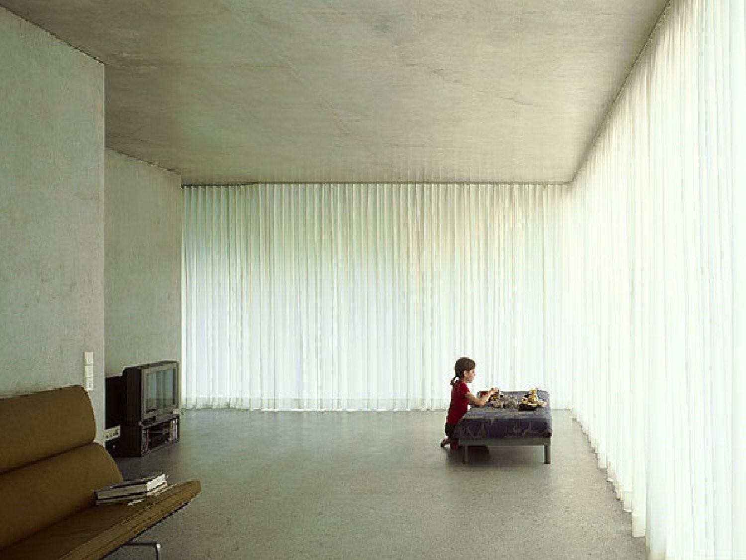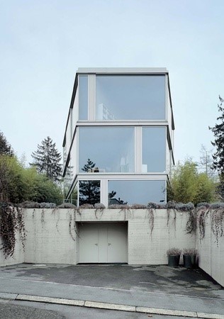 名為“一墻宅”的這座兩戶住宅位于瑞士蘇黎世東南端一個(gè)狹窄的斜坡地段上,建筑僅通過(guò)曲折的混凝土墻將兩戶完全隔開(kāi),并限定每戶使用空間。為更好地享有戶外景觀,各戶的主要功能沿著折墻在垂直方向展開(kāi),從下往上依次為工作室、起居室、廚房、臥室和浴室。