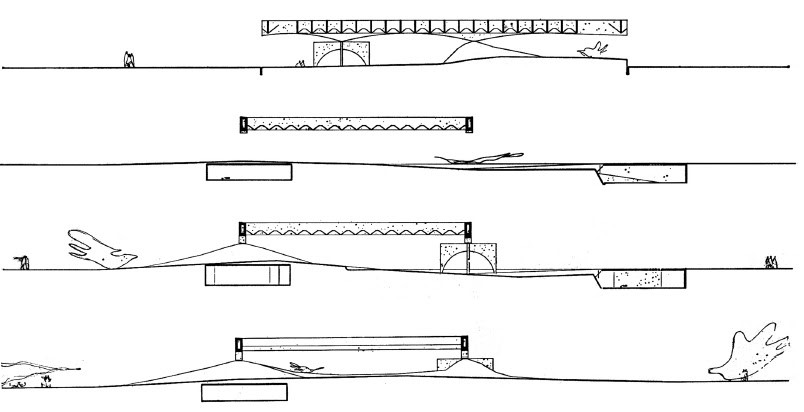 長(zhǎng)50m、寬32.5m的巨大屋蓋由非正交網(wǎng)格上的4個(gè)點(diǎn)支撐在屋頂?shù)倪吘壧帲⒎怯脗鹘y(tǒng)的方式支撐,而在平坦的地面上用混凝土修飾出三座 “山丘”, 其中3根柱子隱藏在 “山丘”中。建筑師創(chuàng)造了一個(gè)假象,仿佛支撐屋頂?shù)牟皇墙Y(jié)構(gòu),而是場(chǎng)地。除了場(chǎng)地內(nèi)凸起的三座“小山”支撐,建筑師還加入了一個(gè)由兩個(gè)圓拱垂直相交構(gòu)成的支撐,成為了場(chǎng)地上唯一的豎直元素,這也是地表上唯一清晰可見(jiàn)的支撐構(gòu)件。