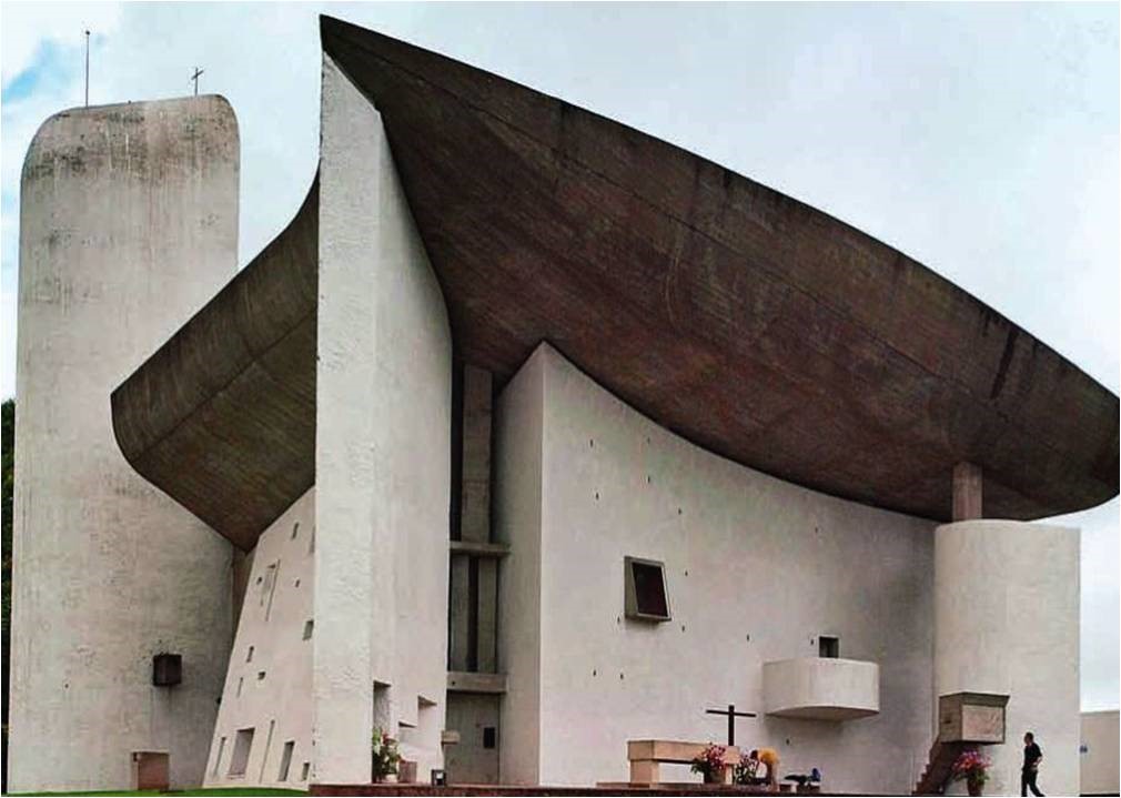 朗香教堂雖然使用噴射混凝土的外表皮,但是沒(méi)有工業(yè)技術(shù)的冰冷,反而是溫暖的“貝殼”融入場(chǎng)地之中。可以說(shuō),朗香教堂正是用其怪誕的方式詮釋了工業(yè)制品的“詩(shī)意”與“快樂(lè)”。