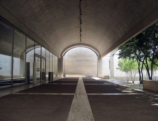 擺線拱頂結(jié)構(gòu)是金貝爾美術(shù)館的重要特征。擺線拱頂為預(yù)應(yīng)力混凝土,在擺形截面上存在類似于普通梁的彎矩,拱形的截面可以有效對(duì)抗彎矩,沿?cái)[線拱頂?shù)目v向進(jìn)行后張拉預(yù)應(yīng)力處理,使得拱頂達(dá)到32m的凈跨度,并抵消梁身極易產(chǎn)生的彎曲變形。出于結(jié)構(gòu)考慮,在每個(gè)拱頂?shù)亩祟^設(shè)置厚度達(dá)到一定要求的圓拱形隔板,這也是在每個(gè)拱頂端部墻面產(chǎn)生高度不一樣的弧形光帶的原因。