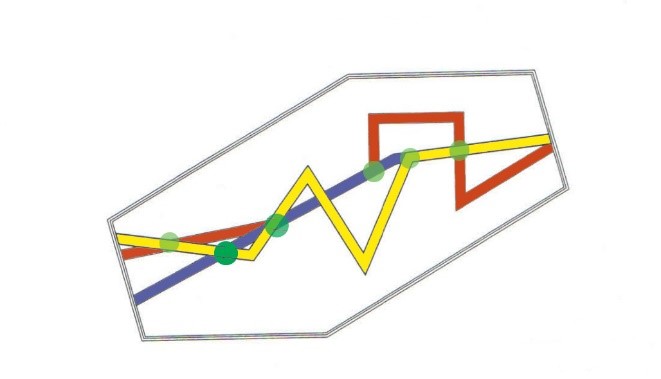 建筑的結(jié)構(gòu)設(shè)計(jì)追隨著“用一道墻將室內(nèi)劃分為兩半”的功能方案執(zhí)行,400mm厚的鋼筋混凝土墻同時(shí)也支撐著寬闊的懸挑樓板。墻的形態(tài)在平面上呈折板狀,而折角的位置與角度在各層都不一樣。與直線的墻體相比,折板墻體具有更好的抗彎性能和穩(wěn)定作用。各層墻體的交接之處形成“柱點(diǎn)”,頂層墻體通過(guò)分段懸挑的形式將荷載交匯于頂層墻體與地面層墻體的 “柱點(diǎn)”,再通過(guò)預(yù)施的拉力將荷載引導(dǎo)至地面層墻體與底層墻體的“柱點(diǎn)”,最終由底層墻體將荷載傳入大地。由于墻體和樓板作為一個(gè)整體,建筑在剖面上可看成三段堆疊的“工字鋼”,增加了建筑的整體性和穩(wěn)定性。