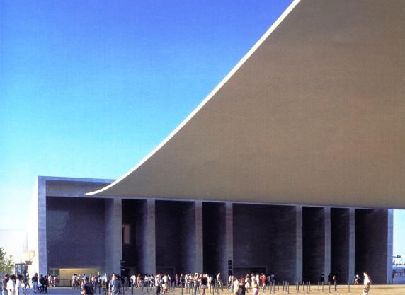 1998年里斯本世博會(huì)的葡萄牙國(guó)家館體現(xiàn)了西扎所追求的“純凈”概念,同時(shí)也是優(yōu)秀的結(jié)構(gòu)表達(dá)。這一片長(zhǎng)65m、寬58m、離地高度最低10m的巨大懸拉結(jié)構(gòu)所遮蓋的半開(kāi)敞公共大廳。從遠(yuǎn)處看,它就像海洋上一只潔白的橫帆,猶如天然懸垂的輕柔帳