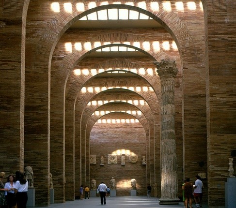 古羅馬藝術(shù)博物館位于西班牙梅里達(dá),處于廢墟之上。莫內(nèi)歐為實(shí)現(xiàn)新舊建筑之間的完美共存,摒棄了用大跨結(jié)構(gòu)跨越廢墟的做法,將混凝土這種強(qiáng)度較大的填充粘結(jié)材料澆筑在兩面薄且平的磚墻之間,即用磚砌成雙層拱圈,爾后在其中澆筑混凝土,最終形成復(fù)合結(jié)構(gòu)從而實(shí)現(xiàn)較大的跨度。磚墻作為“永久模板”保留在混凝土的外表,在獲得高強(qiáng)度的同時(shí)也保留了磚建筑細(xì)膩的肌理感和清晰的建構(gòu)邏輯。