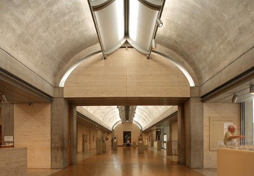 在金貝爾美術(shù)館的結(jié)構(gòu)設(shè)計(jì)上,每一個(gè)單元體具有獨(dú)立完整的擺線拱頂和分布在四角的承重柱,通過(guò)重復(fù)簡(jiǎn)單的單元體,為室內(nèi)空間布局提供最大的靈活性,但是單元各自的拱頂又讓空間在感知上保持相對(duì)獨(dú)立。金貝爾美術(shù)館將設(shè)備管線與拱頂結(jié)構(gòu)巧妙結(jié)合,在拱頂之間的間隔帶處利用下掛梁間的空間形成管線橋架,布置燈槽,并安裝活動(dòng)隔斷。