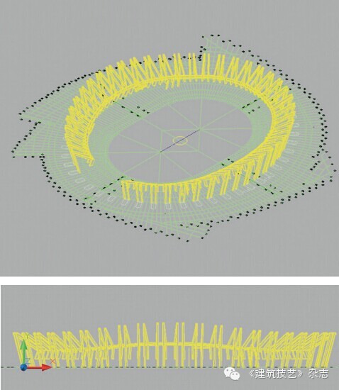 此項(xiàng)目工期短、難度大,從設(shè)計(jì)、施工到構(gòu)件加工、現(xiàn)場(chǎng)裝配都有難度,再加上設(shè)計(jì)院前期提供的圖紙不是很完善,只有體育場(chǎng)整體模型(圖13),尤其是二層看臺(tái)現(xiàn)澆階梯梁平面布置復(fù)雜,平面投影呈折線形,設(shè)計(jì)院結(jié)構(gòu)專業(yè)沒有定位圖,提供的計(jì)算模型導(dǎo)出圖(圖14)可以作為參考,但不能作為指導(dǎo)深化設(shè)計(jì)的依據(jù),所以此現(xiàn)澆階梯型折線梁的空間定位