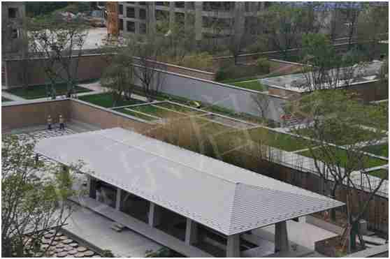 中國(guó)古建筑的四坡屋頂采用陶瓦材料,但陶瓦材料存在諸多缺陷,如重量大,抗震性差,耗費(fèi)土地資源,極易破碎,安裝速度慢,防水效果不好,強(qiáng)度低,遭遇大風(fēng)、冰雹等惡劣天氣時(shí)容易損壞等,已經(jīng)落后于時(shí)代發(fā)展,難以滿足現(xiàn)代建筑技術(shù)對(duì)屋面材料的要求。但是大明宮項(xiàng)目作為典型的中式建筑,萬(wàn)科集團(tuán)和建筑師一致要求屋面系統(tǒng)在外觀上必須能夠表現(xiàn)東方傳統(tǒng)建筑文化的理念,這是一條不能突破的紅線。為了滿足業(yè)主和建筑師的要求,屋面承建單位北京啟廈建筑科技有限公司推出了橫鋪階梯屋面系統(tǒng)。這種以現(xiàn)代工藝加工制作的金屬板材,不僅能夠避免傳統(tǒng)屋面材料的種種弊端,更能以其特有的外觀以及強(qiáng)烈的層次感原汁原味地展現(xiàn)古樸高雅的中式屋面建筑效果。經(jīng)過(guò)多方考察比較,最終確定了采用深灰色的橫鋪階梯屋面系統(tǒng)作為冬院茶室、夏院涼亭和樓宇大堂的坡屋面材料。