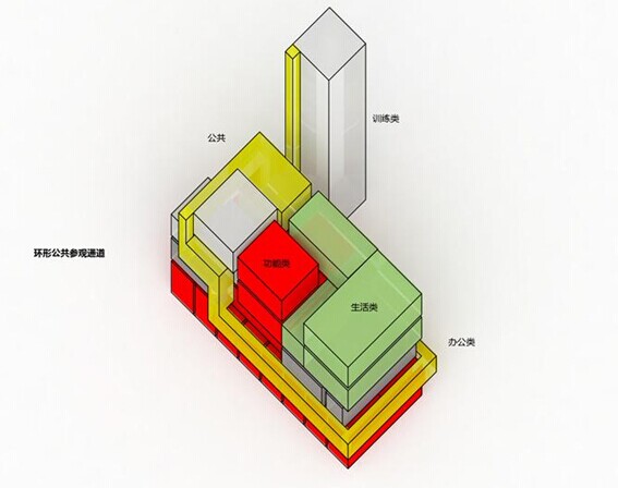 基于上述分析初步形成消防站的建筑原型,黃色部分為環(huán)形公共參觀流線(xiàn),可變動(dòng);藍(lán)色、綠色部分作為標(biāo)準(zhǔn)化,不允許變更。而再將此原型應(yīng)用到不同基地,就產(chǎn)生了豐富的多樣性,可以以此適用于不同的場(chǎng)地。