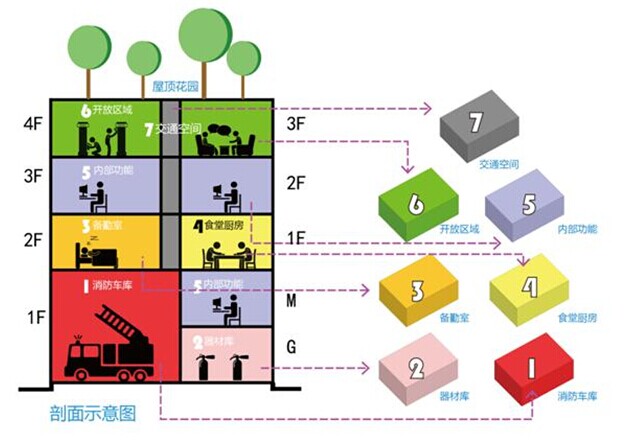 深圳普集建筑設(shè)計(jì)顧問(wèn)有限公司獲得評(píng)委票選第二名,匯報(bào)人楊小荻應(yīng)用設(shè)計(jì)思維,引入關(guān)聯(lián)性設(shè)計(jì)的設(shè)計(jì)方式,“我們不是設(shè)計(jì)某一個(gè)消防站,而是一個(gè)系統(tǒng)”,實(shí)現(xiàn)不同基地上的標(biāo)準(zhǔn)化。他將消防站的功能結(jié)構(gòu)分類(lèi)再重新打散組合,其中功能類(lèi)的需要時(shí)簡(jiǎn)單高效、辦公生活類(lèi)則要求隱私舒適,公共類(lèi)可開(kāi)放宣傳。提供更好的生活和工作環(huán)境、利用屋頂多層平臺(tái)、考慮獨(dú)立的參觀流線(xiàn)是他主要考慮的幾個(gè)點(diǎn)。
