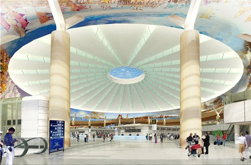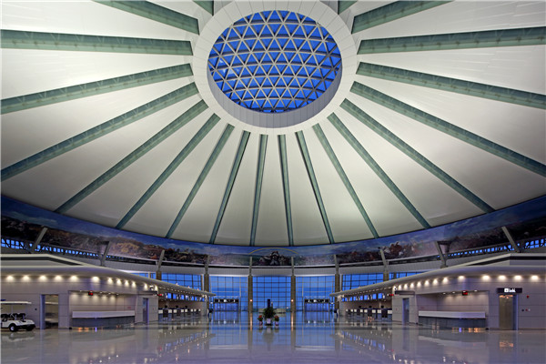 與建筑形象相呼應(yīng),一個(gè)108m直徑的空間由24組V型鋼柱支撐,宏大的屋頂漂浮于32m的高空,中心30m直徑的透空天窗與24根放射形鏤空結(jié)構(gòu)梁一起塑造出對于太陽的崇拜和獨(dú)特的空間體驗(yàn)。穹頂下部一幅長達(dá)300m的手繪油畫長卷,將按8個(gè)方位描繪草原天驕成吉思汗的一生,同時(shí)反映草原上的風(fēng)土人情。天光云影將隨時(shí)間的推移游離于航站樓大廳的每個(gè)角落。歷史、傳說、藝術(shù)、象征,現(xiàn)代交通、現(xiàn)代建造理念與建造技術(shù)共同凝聚在一起,構(gòu)成了鄂爾多斯最重要的門戶,演繹出“蒼天白云,大漠雄鷹”的主題。