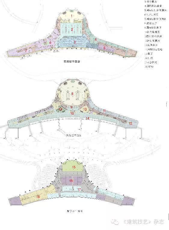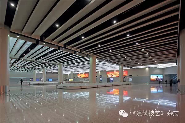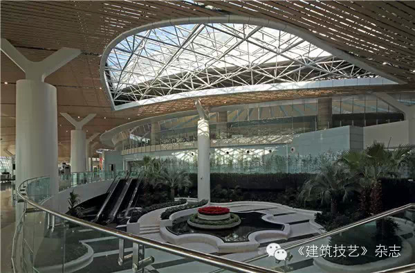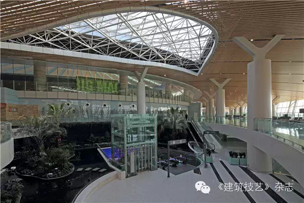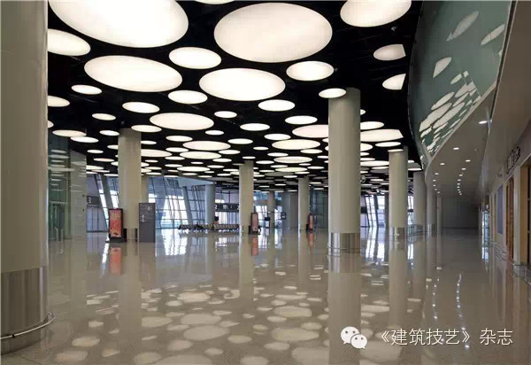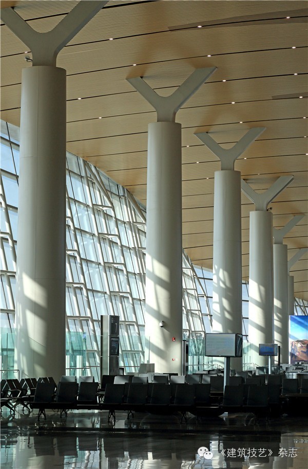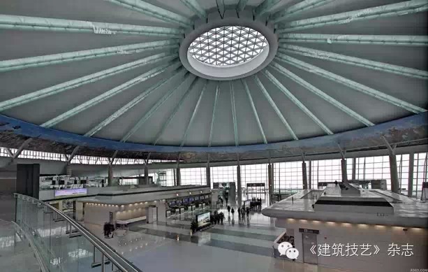 上部大型鋼屋蓋采用混凝土鋼骨柱。航站樓直徑108m的穹頂采用24榀徑向桁架和桁架間的單層網(wǎng)架組成的錐形鋼屋蓋。中間30米直徑的鋼結(jié)構(gòu)采用自我開發(fā)的軟件計(jì)算,達(dá)到“輕”“薄”“透”的要求。 大廳內(nèi)的24根鋼骨柱支撐的的結(jié)構(gòu)桁架最終演化為采光天窗的“光梁”;柱子與屋面的銜接處采用V型的鋼結(jié)構(gòu)支撐,剛勁有力,有效地減小了結(jié)構(gòu)跨度;幕墻的鋼拉索結(jié)構(gòu)為室內(nèi)提供了通透的效果,遮陽板同時(shí)成為了水平龍骨;穹頂中心的單層殼體結(jié)構(gòu)與模數(shù)化的三角型采光天窗合二為一。