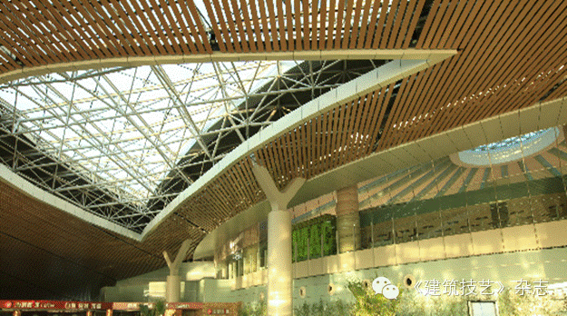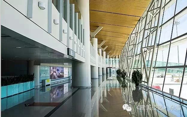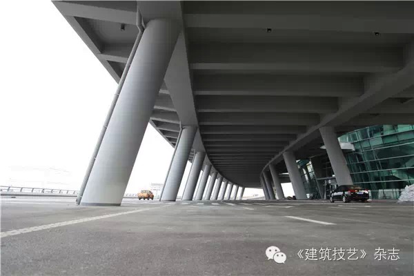 航站樓主體鋼骨柱與鋼結(jié)構(gòu)屋蓋的連接采用Y型支撐。25米出挑的雨棚和主體采用鏈接式結(jié)合,取消了一排支撐柱子,成為單排支撐的雨棚。停車樓采用預(yù)應(yīng)力空心樓蓋,預(yù)應(yīng)力采用緩粘結(jié)和無粘結(jié)預(yù)應(yīng)力技術(shù)。