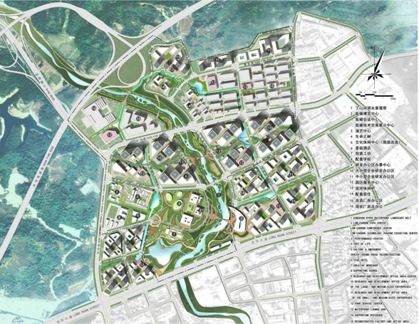 設(shè)計(jì)說明:方案結(jié)合原規(guī)劃中提出的難點(diǎn)問題:資源整合、低碳文化、規(guī)劃彈性與時(shí)效性、地區(qū)活力、地方經(jīng)濟(jì)等方面的內(nèi)容,提出了適應(yīng)該地塊發(fā)展的十大規(guī)劃設(shè)計(jì)原則: