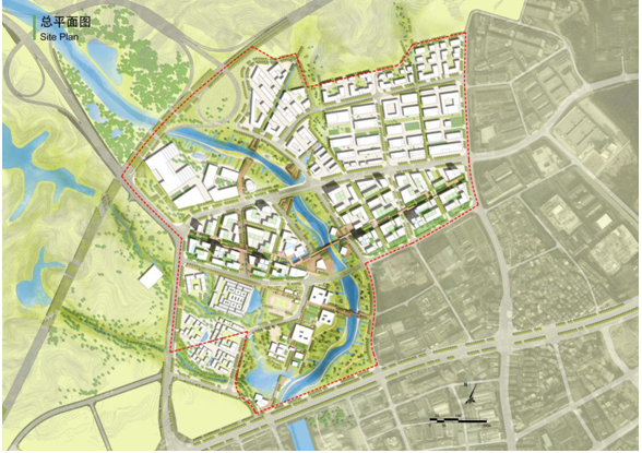 設(shè)計(jì)說明:我們結(jié)合自然水體以及城市肌理,考慮多種功能的需求以及復(fù)雜的交通形式,引入了一條橫向的復(fù)合型城市中軸;通過退臺以及半圍合建筑形態(tài)打造多層次屋頂綠化空間和下沉庭院空間;復(fù)合軸將多個(gè)退臺式庭院串聯(lián),營造出承載了生態(tài)景觀、綠色交通、生產(chǎn)及生活性服務(wù)的活力共享空間——“生態(tài)慧谷”。