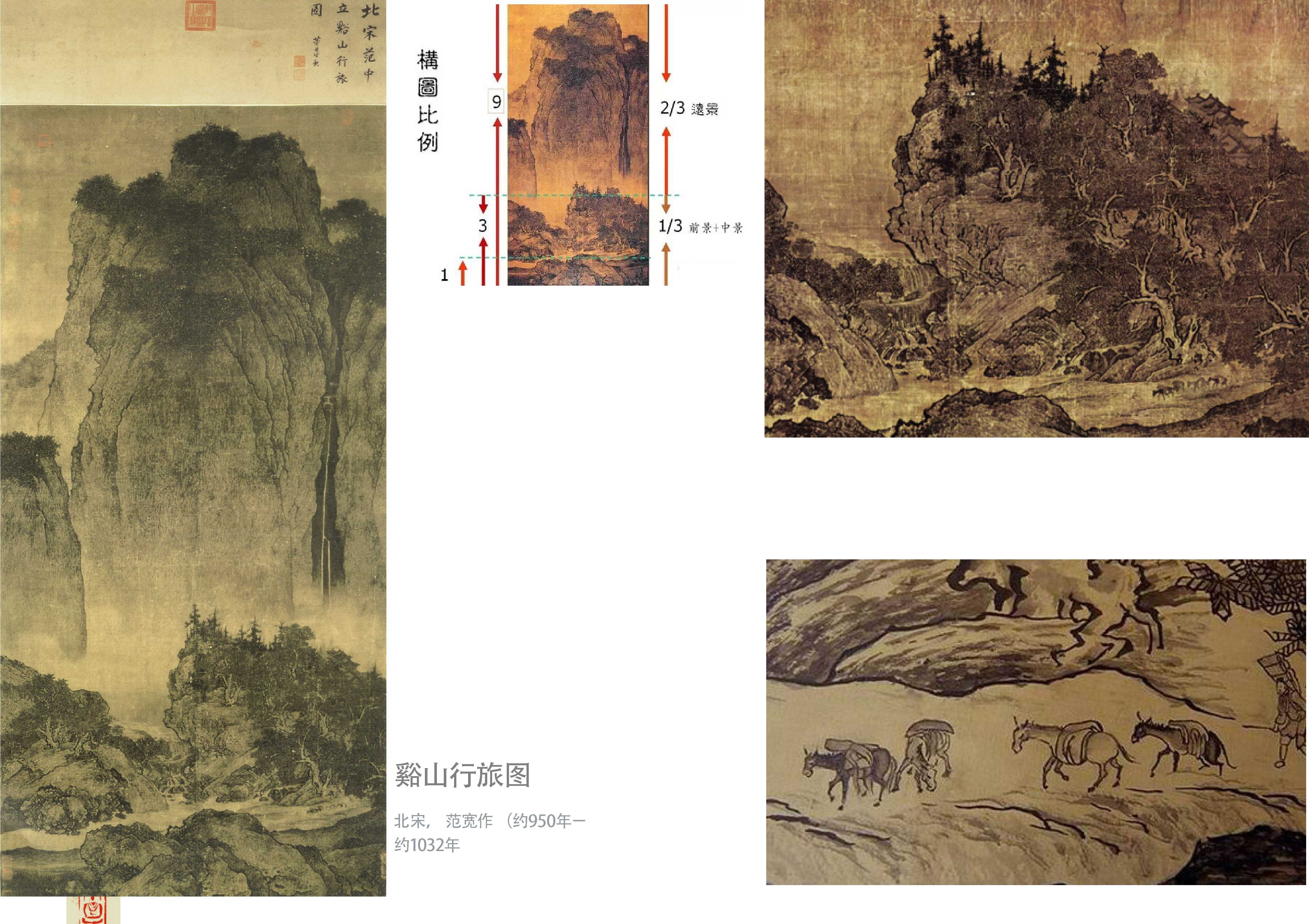 北宋畫家范寬作的舉世聞名的“谿山行旅圖”,選這張圖的目的是中國畫遠(yuǎn)景,中景和近景的關(guān)系。近景, 中景, 遠(yuǎn)景的比例大致為1:3:9,遠(yuǎn)景的山和近景的墨色一樣厚重, 同時遠(yuǎn)山和近景之間未加油墨, 反而襯出虛無縹緲之感, 而遠(yuǎn)山對觀者而言忽遠(yuǎn)忽近, 這就是中國畫中的不定性, 畫以意念為轉(zhuǎn)移。