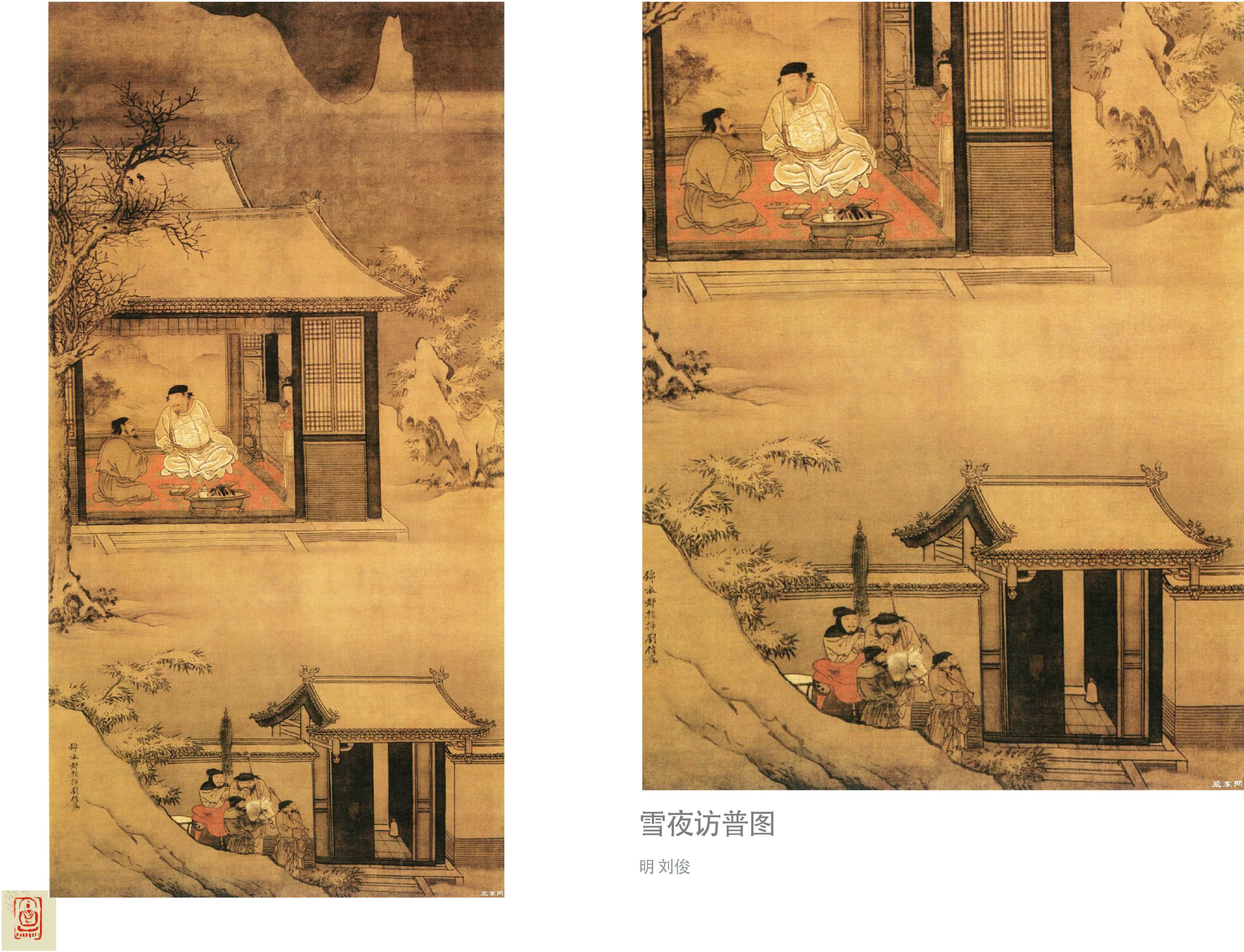 雪夜訪普圖也是從高至地的多點透視,從在室內(nèi)圍著爐火談?wù)搰掖笫碌内w匡胤和臣子趙普, 到院門外凍得瑟瑟發(fā)抖的隨從,以及屋瓦庭院, 都是按照視點的移位所作。
