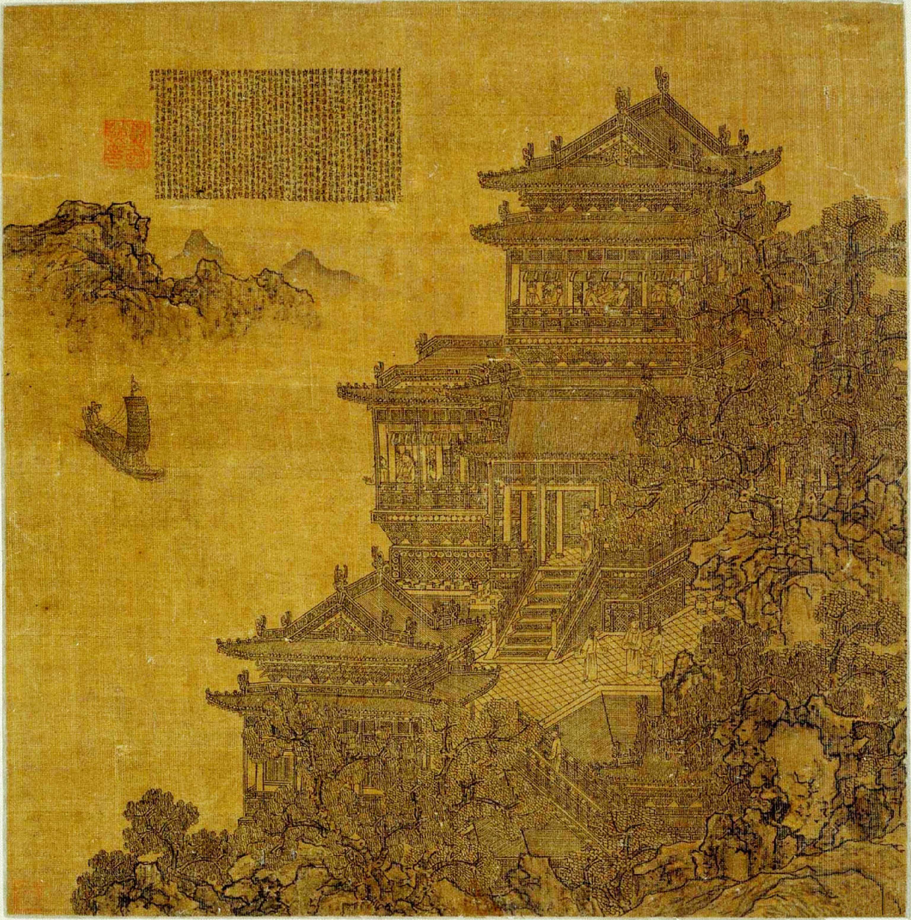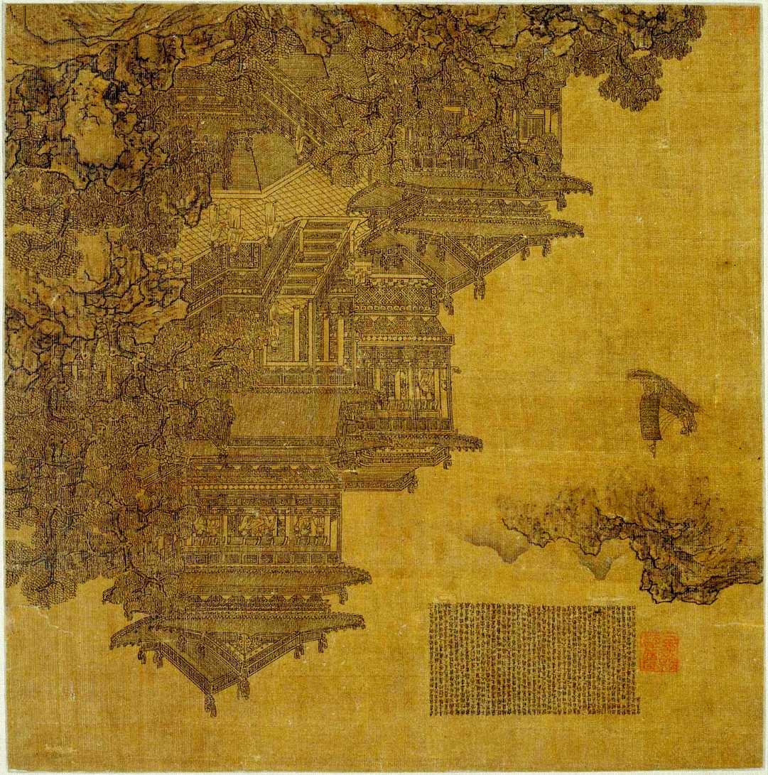 以滕王閣圖舉例, 右側(cè)的滕王閣的視點由上而下, 極為細(xì)密的勾勒出建筑的結(jié)構(gòu)和景觀形態(tài)。左側(cè)大量留白, 又有船和遠(yuǎn)山,沒有畫水, 沒有畫天, 水天融合在一起,帆船仿佛天上游。“孤帆遠(yuǎn)影碧山盡, 唯見長江天際流”的鏡頭感就是如此。