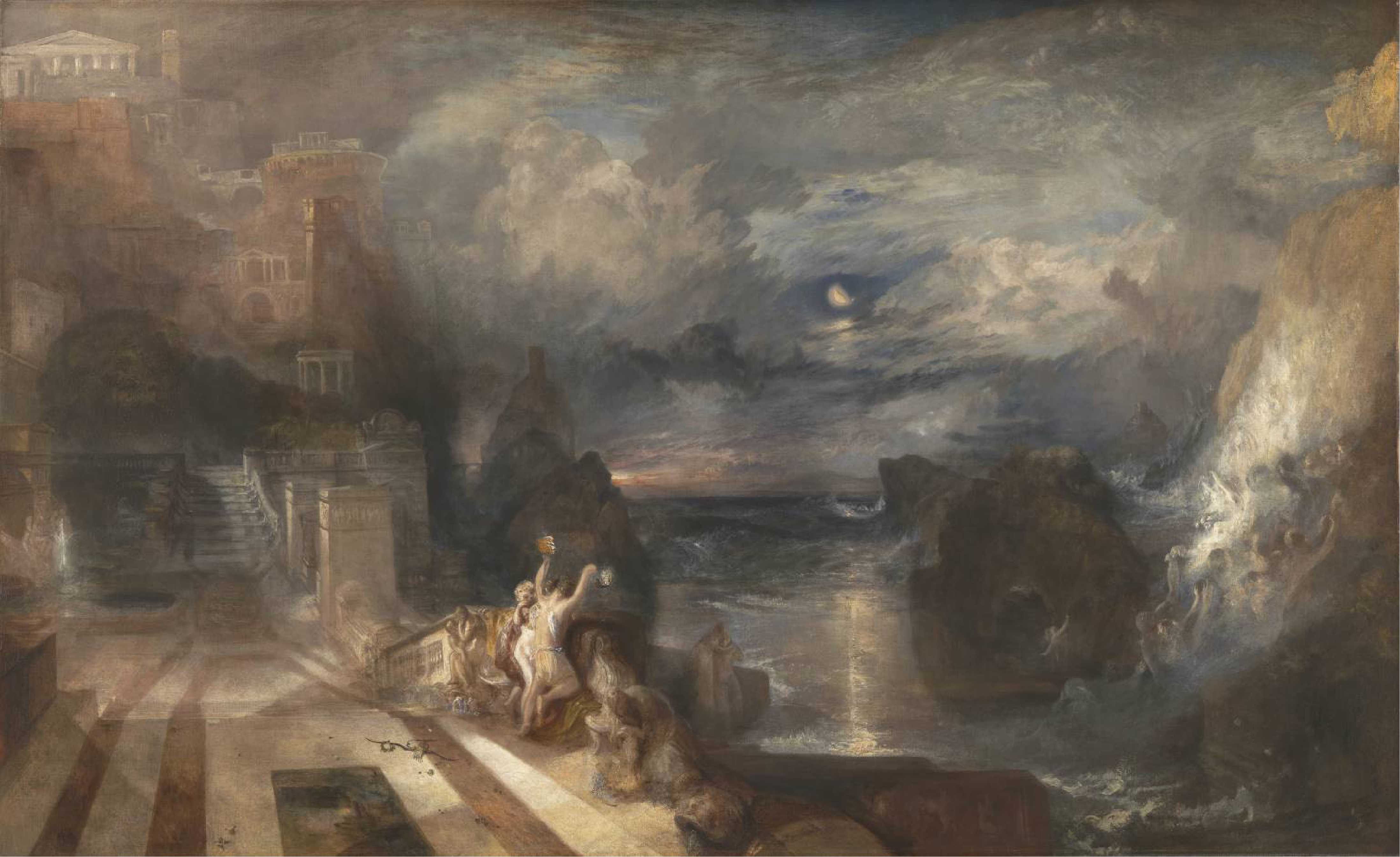 西方古典繪畫則敘事意識更強, 幾乎都圍繞著宗教或傳說主題, 把故事內(nèi)容搞清楚了, 畫面也看懂了, 對場景的宣揚也是戲劇化的, 猶如在舞臺上的布景和表演整合。 比如說這張透納西羅和令德的悲劇場景 (令德是西羅的情人, 每天跨海游泳來探望女祭司西羅, 但某日狂風(fēng)大作, 令德沉寂大海, 西羅悲痛欲絕, 也跳海身亡)其實都以看客的眼光來接受被展示的事件,因此是客觀的。
