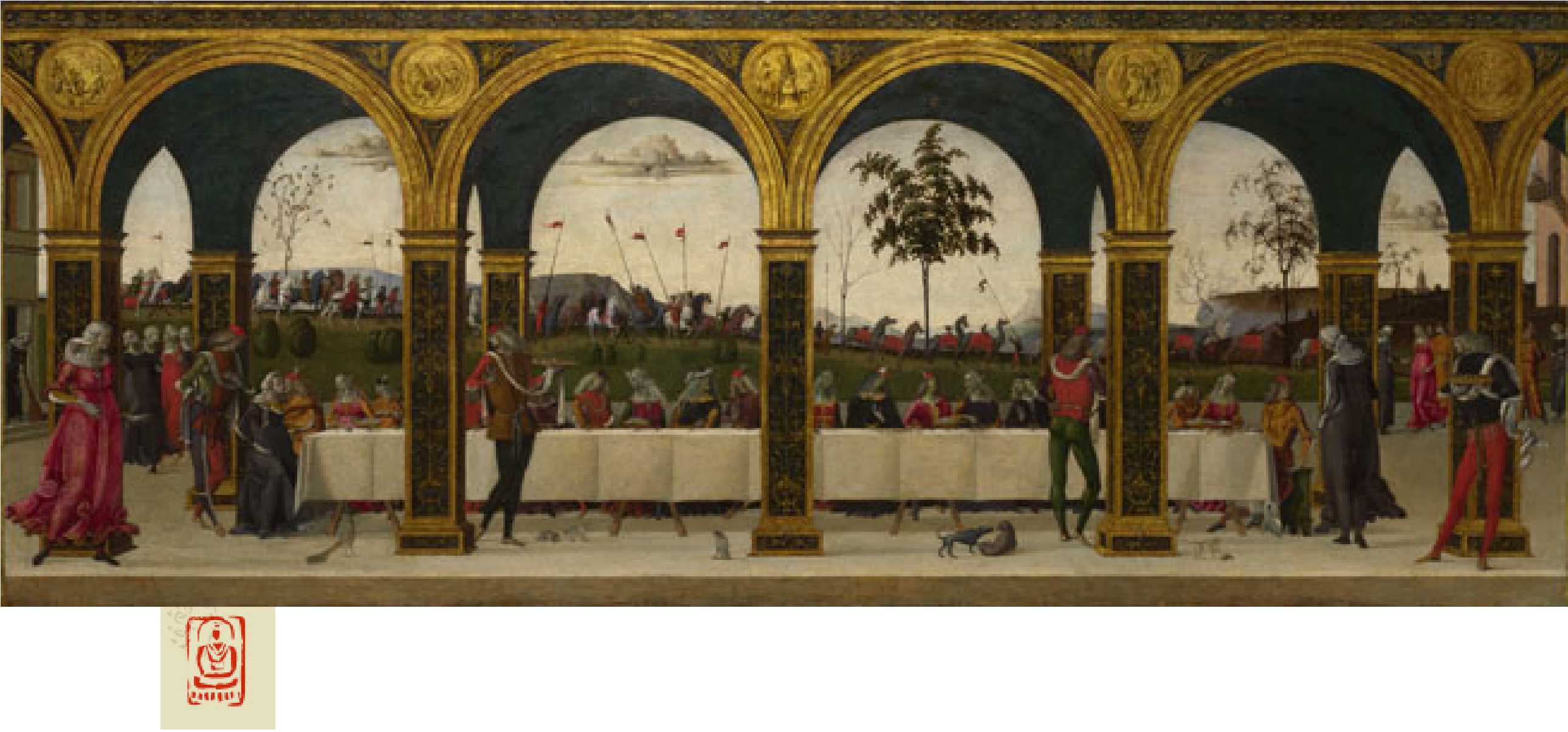 這一套圖從時間的順序上表現(xiàn)出事情的發(fā)展 :結(jié)婚-放逐 -重逢 , 更有意思的是在每張圖中也表現(xiàn)了額外的時間軸:比如說在“結(jié)婚”場景里, 右側(cè)遠(yuǎn)景侯爵牽引著格麗塞達(dá)從農(nóng)舍走出來, 繼續(xù)往左看,格麗塞達(dá)脫掉簡樸的著裝, 赤身裸體, 畫面的中間的格麗塞達(dá)這時已經(jīng)穿上了華服, 到了畫面的最左邊, 他們騎上了馬, 準(zhǔn)備回到侯爵官邸 。在第二幅場景中, 從圖像的中心到右邊表現(xiàn)了伯爵脫掉格麗塞達(dá)的華服并驅(qū)逐她離開的場景。在這每張圖里, 同樣的人物出現(xiàn)了三,四次!這種時間軸套時間軸的做法好像是在翻一本連環(huán)畫書, 敘述性極強。