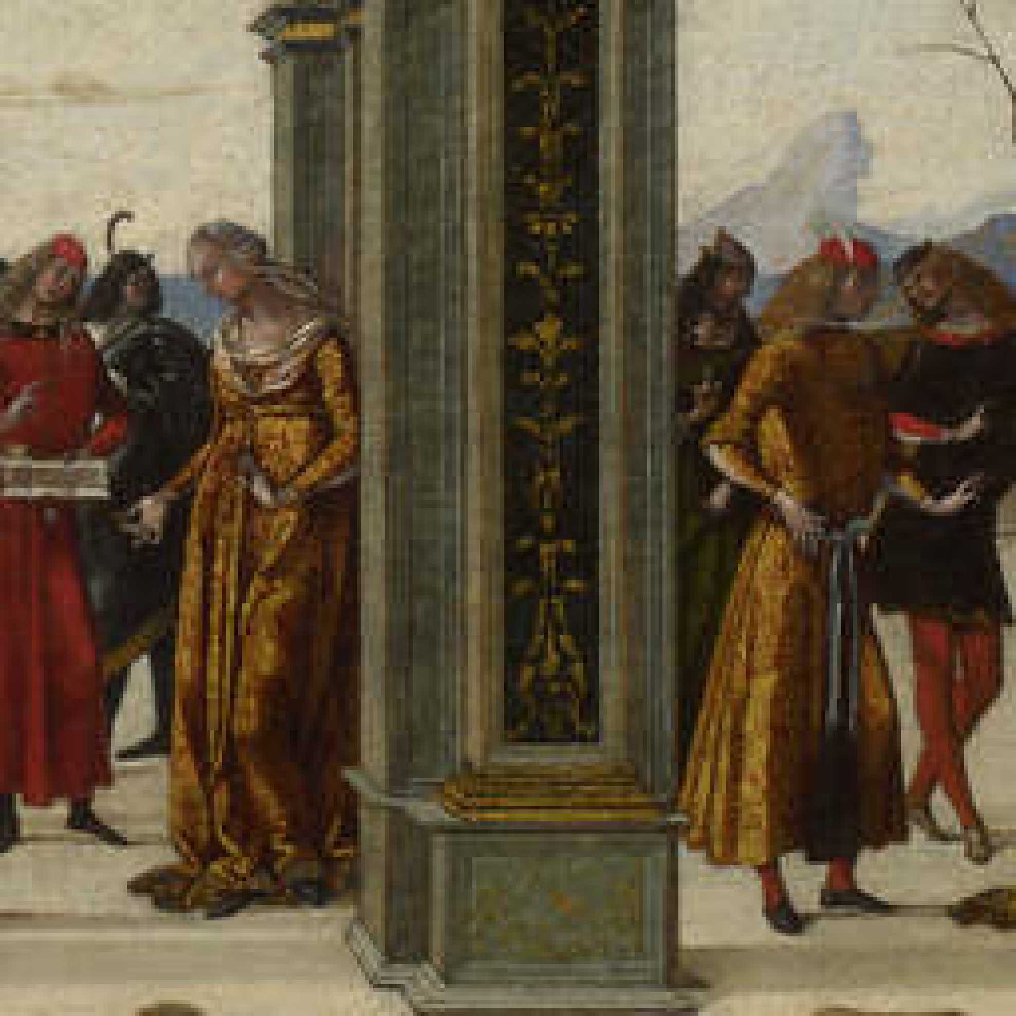 The Story of Griselda, Part I: Marriage The first scene shows the marquis hunting and meets his chosen bride Griselda, a poor girl. He visits her father's house and announces that he will marry Griselda on the condition of her absolute obedience. He leads her away to exchange her old clothes for rich ones and is shown marrying the marquis.The Story of Griselda, Part II: Exile The scene depicts the marquis putting Griselda's obedience to the test by giving her baby to a servant, and making her believe it is to be killed. The marquis pretends to dissolve the marriage, and instructs her to return to her father's house.The Story of Griselda, Part III: Reunionabout 1494The scene shows the marquis visiting Griselda at her father's house and instructing her to sweep his house for his supposed second marriage. Her children then arrive (unrecognised since she thought they had been killed), and the marquis finally reveals to Griselda that her trials were invented to test her obedience.