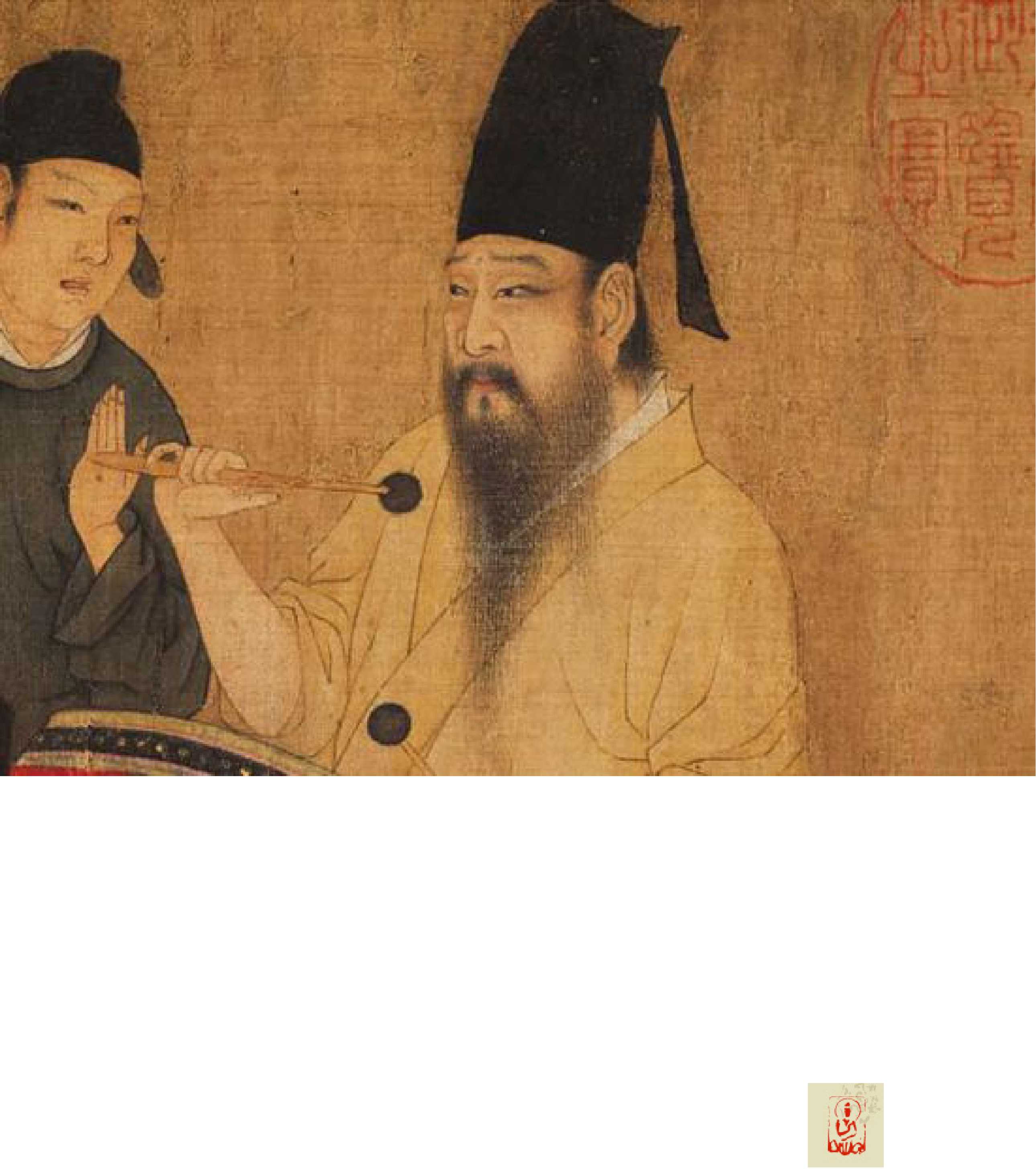 本圖是偵探顧大臣眼識心記后所畫, 可謂間諜情報的畫本。 卷軸中韓熙載出現(xiàn)了5次, 從宴會開始到結(jié)束, 分為聽樂, 觀舞,休息, 清吹和宴散等5部。 橫觀此圖,一個有意思的現(xiàn)象誕生了, 是什么? 原來出現(xiàn)了時間軸。 在一幅靜態(tài)的畫卷中, 插入了動態(tài)的時間, 從二維直接跳躍到四維,可謂獨創(chuàng)。