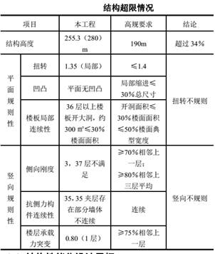 本主要超限情況如下表所示。結構在核心筒內(nèi)38層以上設置約88.2m深的空中共享天井,見圖4。針對本工程的超限情況,采取了相應的抗震加強措施。