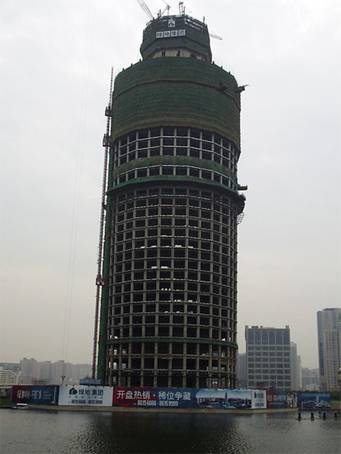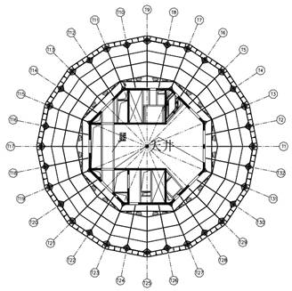 本建筑外框柱均為斜柱。外框柱從地上2層開始逐漸向外傾斜,在35層處平面直徑達到最大,然后轉(zhuǎn)折逐漸向內(nèi)傾斜,一直延伸到屋面。柱在鉛垂平面呈二維多段折線,折線斜柱完美地勾勒出塔樓外形。同時辦公層內(nèi)沒有柱子影響,大大提高了建筑空間的使用品質(zhì)。
