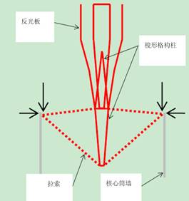 塔尖反光器采用“弓箭式”結構。反光器猶如一朵盛開喇叭花,由四個葉片組成,葉片采用空間桁架結構均與中心處花蕊桁架相連,花蕊猶如一支弓箭的“箭”;在核心筒頂端設置“弓弦”支承上面的花蕊及花瓣,弓箭的弓采用圓鋼管,弓弦由8組每組兩根高強度拉索組成,采用直徑50mm的高釩索拉結于核心筒八角。四個花瓣上分布有不同角度的漫反射板,將太陽光反射至酒店天井中不同深度,可謂巧奪天工,其效果圖及結構概念設計如圖6所示。