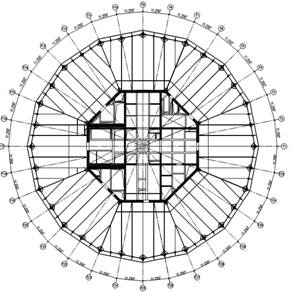 環(huán)向鋼梁與型鋼混凝土組合柱剛接,徑向八根與核心筒角部對應的鋼梁兩端與墻及框架柱均剛接,其余鋼梁與框架梁、柱、核心筒均鉸接。核心筒周邊剪力墻墻厚為900~400mm;型鋼混凝土外框架柱截面為從下往上φ1200mm~φ850mm,混凝土強度等級為C60~C40。結構用鋼量(鋼材)指標約103kg/m2。圖3,4為典型辦公層及酒店層結構平面布置示意圖。