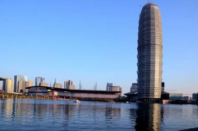 塔樓創(chuàng)意源自于中國古代寶塔嵩岳寺塔,建筑體型呈“紡錘”形。酒店區(qū)核心筒內(nèi)樓板開洞,形成一個約88m深的共享天井,天井頂端天窗上矗立一高約30m的陽光反射器,陽光通過反射器的反射照入天井內(nèi),使得天井可以自然采光。