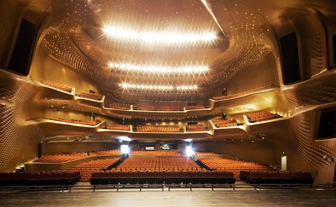 要滿足以上諸多方面的要求,同時又要延續(xù)扎哈的風(fēng)格。中孚泰團(tuán)隊在室內(nèi)設(shè)計中充分理解了建筑的語匯,順勢而為,利用這些異形雙曲面形體構(gòu)成良好的聲學(xué)構(gòu)造,達(dá)成聲學(xué)之美的目的。同時用分解的觀念強(qiáng)調(diào)打碎、疊加、重組,重視形態(tài)、動感、節(jié)奏、韻律、獨特、情境、多元化表現(xiàn)室內(nèi)空間的設(shè)計;以GRG材料的“融力”,以突出自然主題的力量、材料自身的美感和質(zhì)感,又結(jié)合了形式感強(qiáng)烈的現(xiàn)代雕塑語言為結(jié)構(gòu)支撐,彰顯強(qiáng)悍的氣質(zhì),結(jié)構(gòu)嚴(yán)謹(jǐn),充滿氣勢與張力,實現(xiàn)了其“雙手環(huán)抱形”看臺這種不規(guī)則室內(nèi)體形以及“倒八字形”樂池等設(shè)想,有利于聲場的擴(kuò)散和創(chuàng)造音質(zhì)的空間感,保證了世界上僅有的兩個非對稱設(shè)計觀眾廳之一的優(yōu)良音質(zhì)效果。
