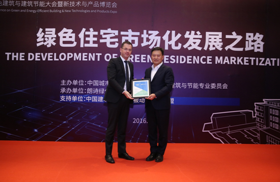 朗詩集團&朗綠科技董事長田明從世界銀行負責(zé)人塞爾吉奧·皮門塔手中接過朗詩布魯克被動房獲得的中國首個EDGE認證