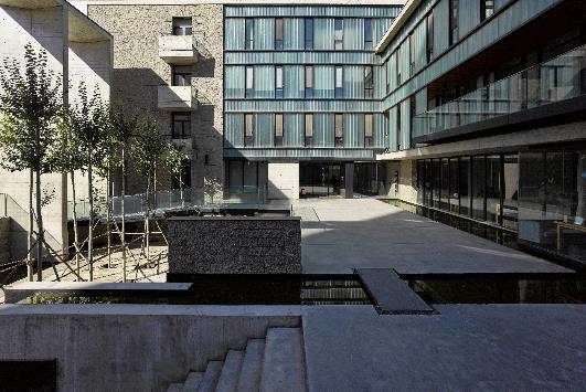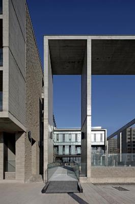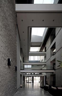 設計樓位于內蒙古工業(yè)大學新校區(qū)北側社區(qū)一角,用地40m×40m,地上4層,地下1層,建筑面積5967m² 。功能包括辦公、會議、圖檔、餐廳、健身房、停車等。設計的目標是在遮光、退線等城市規(guī)則決定基本體量的前提下,從形體空間到界面形式再到材質構造,營造屬于設計樓的空間品相。通過以下步驟實現:抽取角部體量留出邊院,并適度下沉,形成從城市空間到室內空間的過渡,增加入口空間的領域性;切分剩余體量,在其間留出中廳,引入陽光、組織通風,形成室內的公共核心空間,增強空間的識別度和場所感;選擇本色的材料和真實的構造統(tǒng)一了空間的基調,試圖讓整體傳達一種內斂、平靜、有歸屬感的場所性格。本項目由內蒙古工業(yè)大學建筑學院張鵬舉教授主持設計。